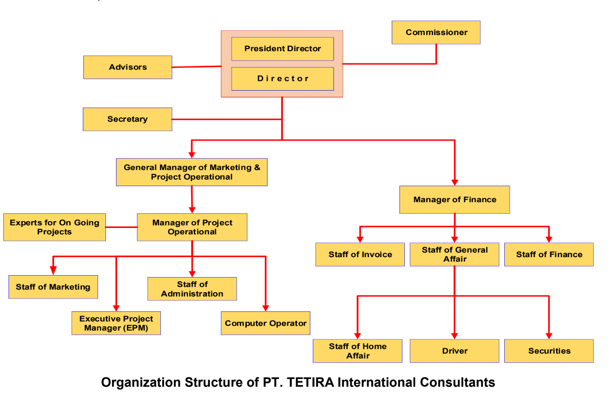 The organization of TETIRA is structured to ensure high quality of services (see figure). While, our management team consists of President Director, Managing Director, Managers, Professional Staff, Advisors and Experts.